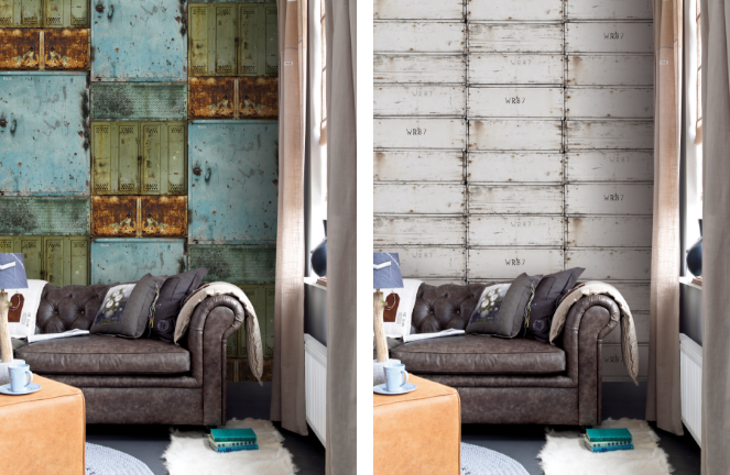 Rustworld is er voor interieurs die wel een oppepper kunnen gebruiken. Een bonte verzameling van oude stalen kasten en elementen vormen hier de perfecte basis voor een stoer interieur. Crateworld is een behang van gestapelde vergrijsde kratjes.