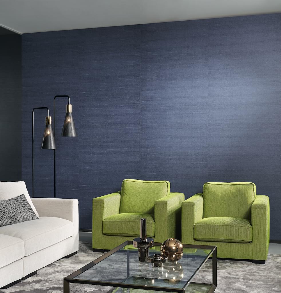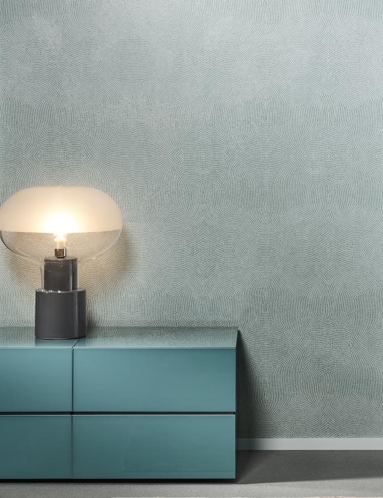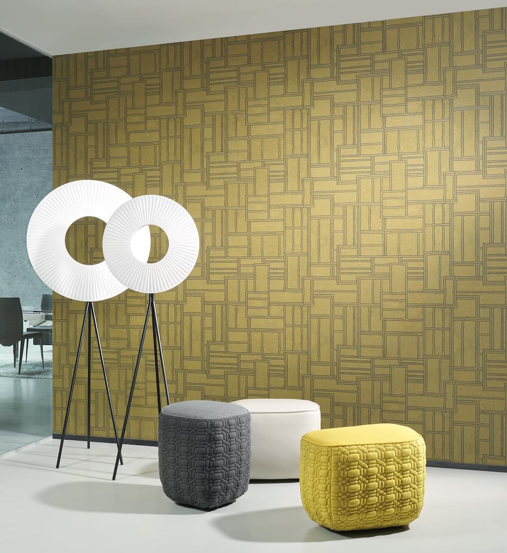 Latus, de effen variant in de collectie, is perfect te combineren met de andere referenties. Om deze variant een evenwaardige uitstraling te geven, werd gekozen voor een zijdelook. Je ziet heel duidelijk de oneffenheden van natuurlijke geweven zijde, met hier en daar een dikkere of ruwere draad maar met de volle en gulle kleuren van echte zijde. Intense tinten, altijd stijlvol. Ze vormen een rustpunt in combinatie met de gedurfdere prints uit deze collectie. Er werd bewust gekozen voor een zijde-imitatie, gedrukt op non-woven, omdat dit kleurvast en ook veel duurzamer is.