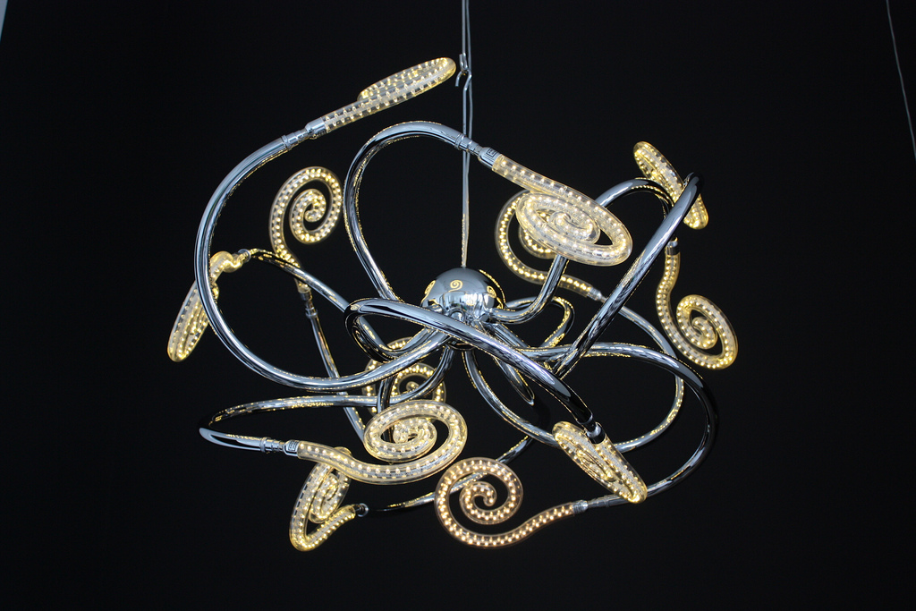 Riccioli is een kroonluchter nieuwe stijl. Moderne LED verlichting in gekrulde ?lighttubes? wordt gecombineerd met verchroomd staal. De slingerende armen geven de lamp haar artistieke karakter mee. Bijzonder is het feit dat deze kunstzinnige LED-luchter kan worden gedimd.
