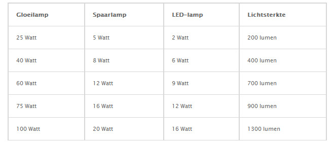 Zo zie je dus dat je voor een ledlamp een minder sterke lamp kunt nemen (in wattage), maar dat zo'n lamp wel evenveel licht geeft als een andere soort lamp met een groter vermogen en dus een groter verbruik.