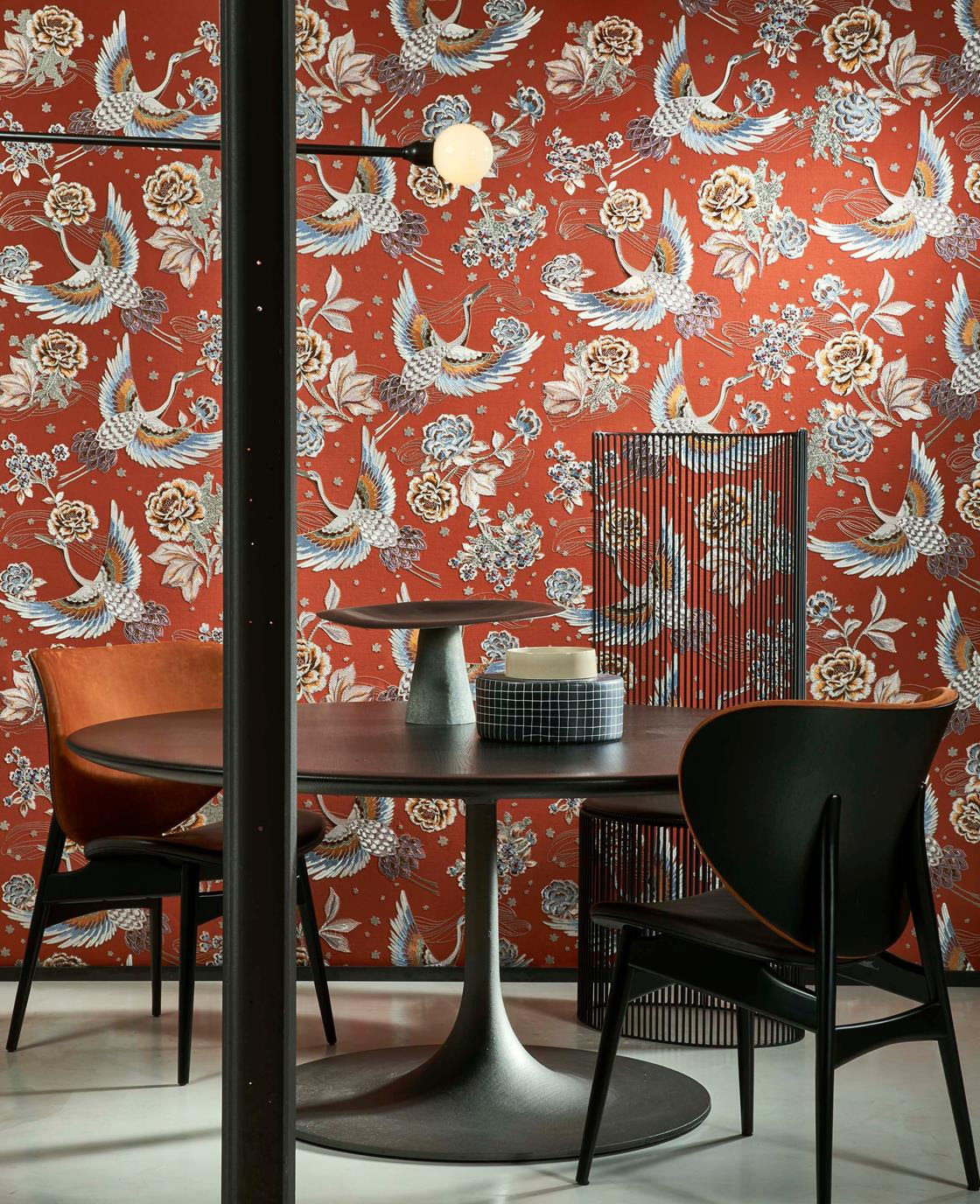 Voor Crane uit de collectie Takara liet Arte zich inspireren door de pracht van kraanvogels in hun natuurlijke habitat. De vogels lijken van de rijkelijk geborduurde stof van katoen en linnen af te vliegen. De muurbekleding wordt op artisanale wijze vervaardigd en met de grootste zorg met de hand aangebracht op de vliesdrager. In combinatie met intense kleuren zoals warm oranje en luxueus zwart wordt je interieur vanzelf ondergedompeld in de bruisende sfeer van de chinoiserie trend.