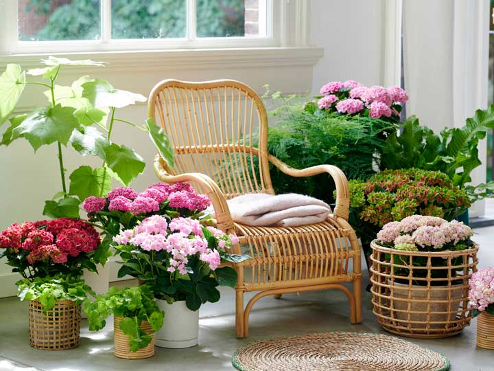 Een kamerhortensia kan prima toegepast worden in elk interieur. Een relaxplek geef je een eigentijdse uitstraling door de hortensia te combineren met groene kamerplanten. Kies daarbij voor een mix van potten van natuurlijke materialen zoals riet, zeegras en bamboe. Je kunt ook een flinke bloemenzee maken door hortensia’s in verschillende kleuren en formaten bij elkaar te zetten. Potten (en manden) in frisse, lichte kleuren zorgen voor een extra vrolijk effect.