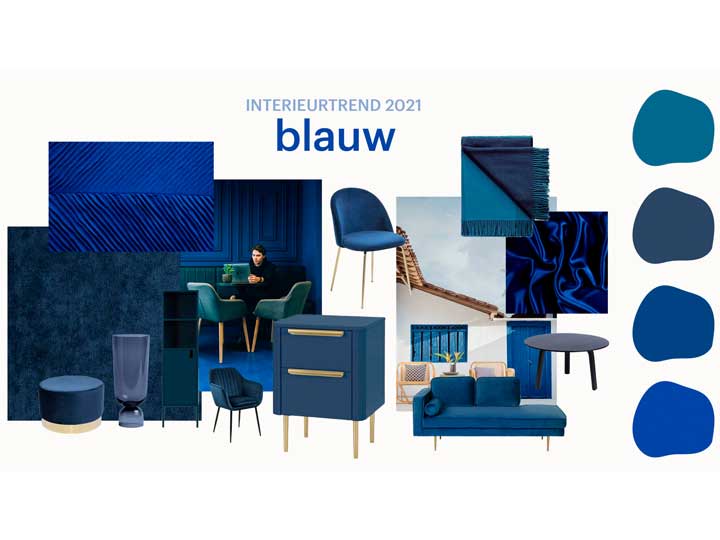 Zwarte meubels en woonaccessoires zullen in 2021 plaats maken voor donkerblauwe objecten. De kleur blauw zorgt voor een origineler en chiquer uitstraling in het interieur.Bovendien is donkerblauw een makkelijke kleur om te combineren én wordt perfect uitgelicht met de trendkleur van het jaar: Brave Ground. Verder zijn poederroze en okergeel traditionele combinaties met donkerblauw, maar ook roest en natuurtinten passen bij deze klassieker.