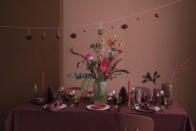 Twee verschillende bossen vormen het middelpunt van komend feestseizoen: de een in uitgesproken, felle kleuren als fuchsia en knalrood, de ander in een uitgebalanceerde mix van roze, dieprood en champagnetinten. De zorgvuldige samenstelling van bijzondere seizoensbloemen en -takken vormen een uitbundig, maar tegelijkertijd stijlvol, chic en elegant geheel. Eenmaal in de vaas pronkt de bos als een echt bloemkunstwerk in je interieur. Zet hem in de hal om gasten een verbluffend welkom te heten, op de eettafel tijdens een feestelijk diner of op de salontafel om vanaf de bank van te genieten.