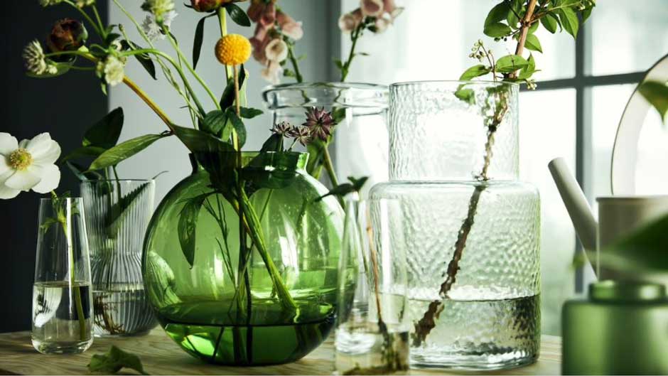 De nieuwe collectie van IKEA creëert een vrolijke lentesfeer in huis. Zet bloemen in de mondgeblazen vazen van gerecycled glas.