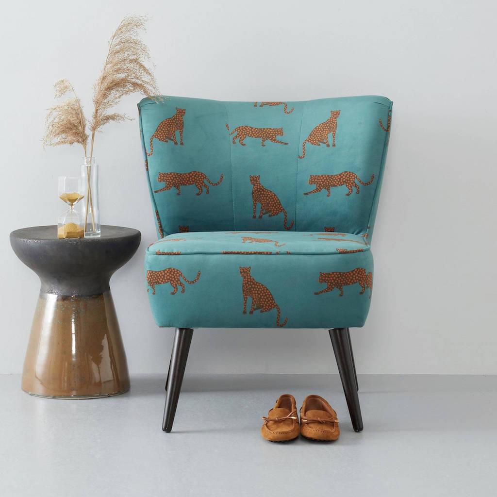 Meteen een perfect voorbeeld. Deze stoel heeft die kenmerkende vintage look, de stof is van velours en de print is een verzameling stoere tijgers in prachtige warme tinten. Hipper krijg je het bijna niet. Deze fauteuil kan echt overal!