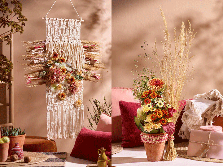 Geïnspireerd door Noord-Afrikaanse invloeden is deze boho-stijl een prachtige, warme en rustige stijl waar neutrale natuur- en beigetinten de hoofdrol spelen. Een perfecte aanvulling zijn de rode, oranje, gele en bronskleurige bloemen, afgewisseld met gedroogde varianten en sierlijke pluimen. Gevlochten riet, hout en macramé maken dit de ultieme stijl voor een ontspannen en positieve leefomgeving.