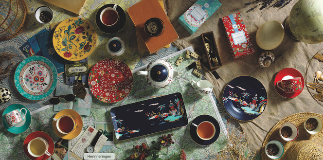De Wonderlust collectie bestaat uit theekoppen en -schotels, mokken, schaaltjes, ronde en rechthoekige borden en thee. Prijzen servies: vanaf € 40,-*. Prijs thee: € 17,-*.