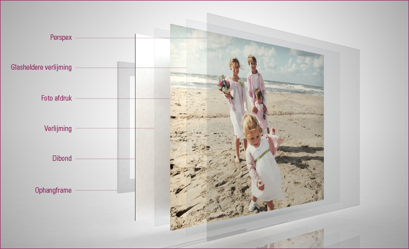 Het plexiglas en de fotoafdruk worden bevestigd op een aluminium dibond achterpaneel van 3 mm dik voor extra stevigheid.