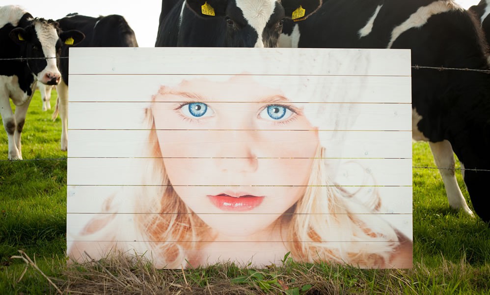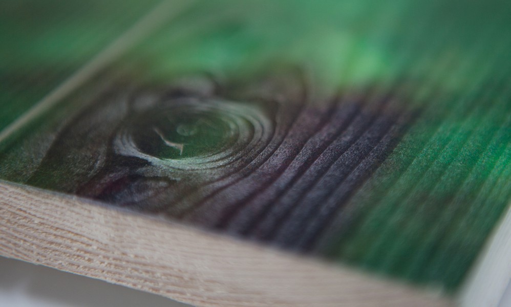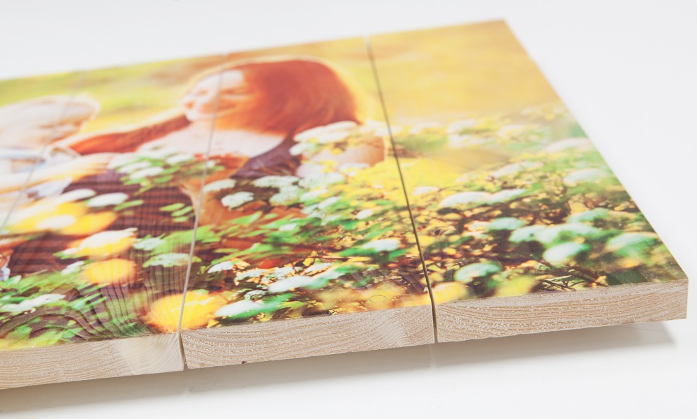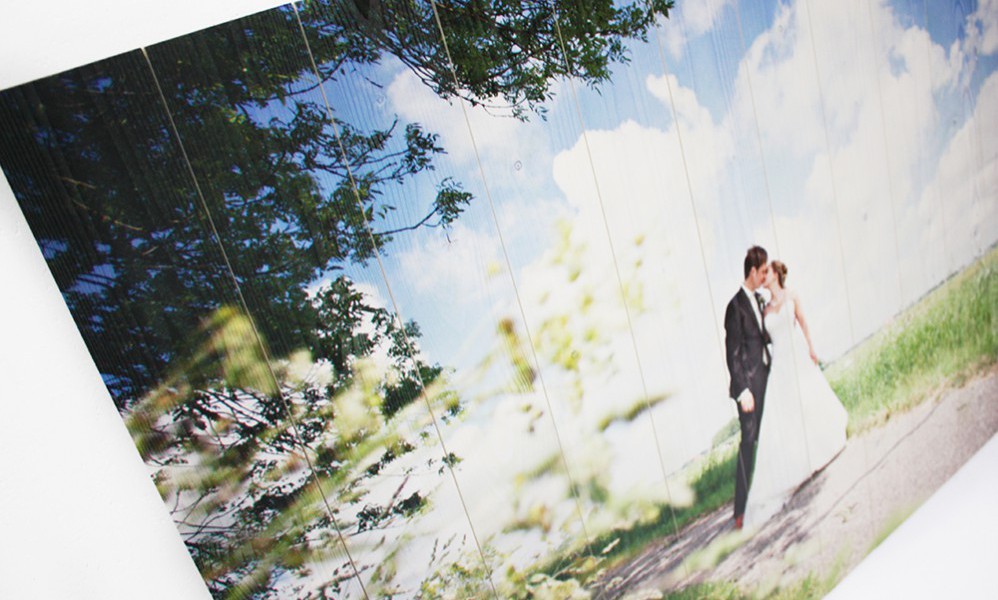 Voor de mooiste uitstraling verkiezen wij de foto te printen op houten latjes van 10cm breed, deze monteren wij als een paneel, welke dan in een keer wordt geprint. Het printen gebeurd niet met oplosmiddelen, maar met UV-drogende inkt, welke met UV lampen direct wordt gedroogd. Doordat er geen (chemische) oplosmiddelen in de inkt zitten is er meer plek voor pigment, en dus meer kleurkracht in het eindresultaat. Bijkomend voordeel is dat het product 100% biologisch is.