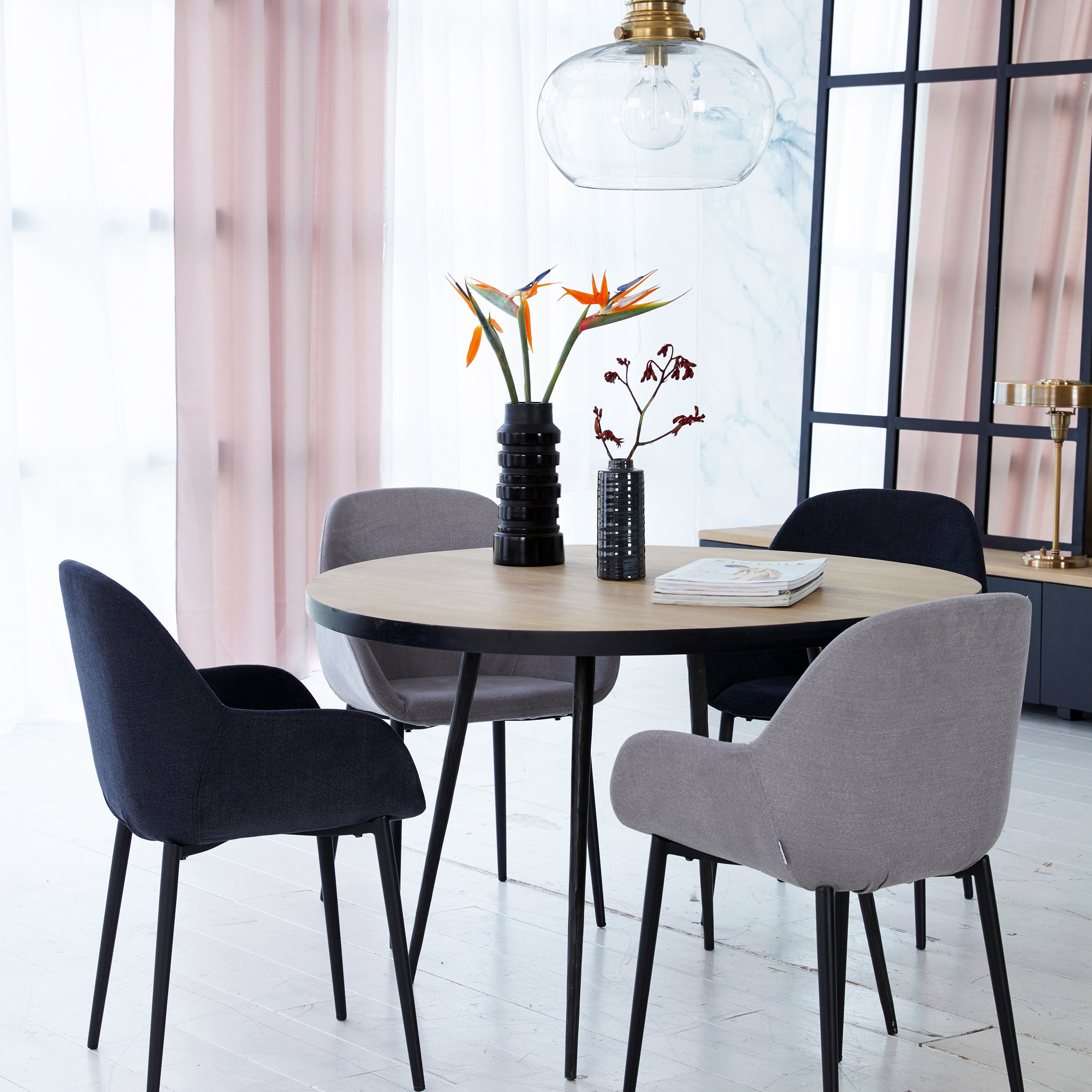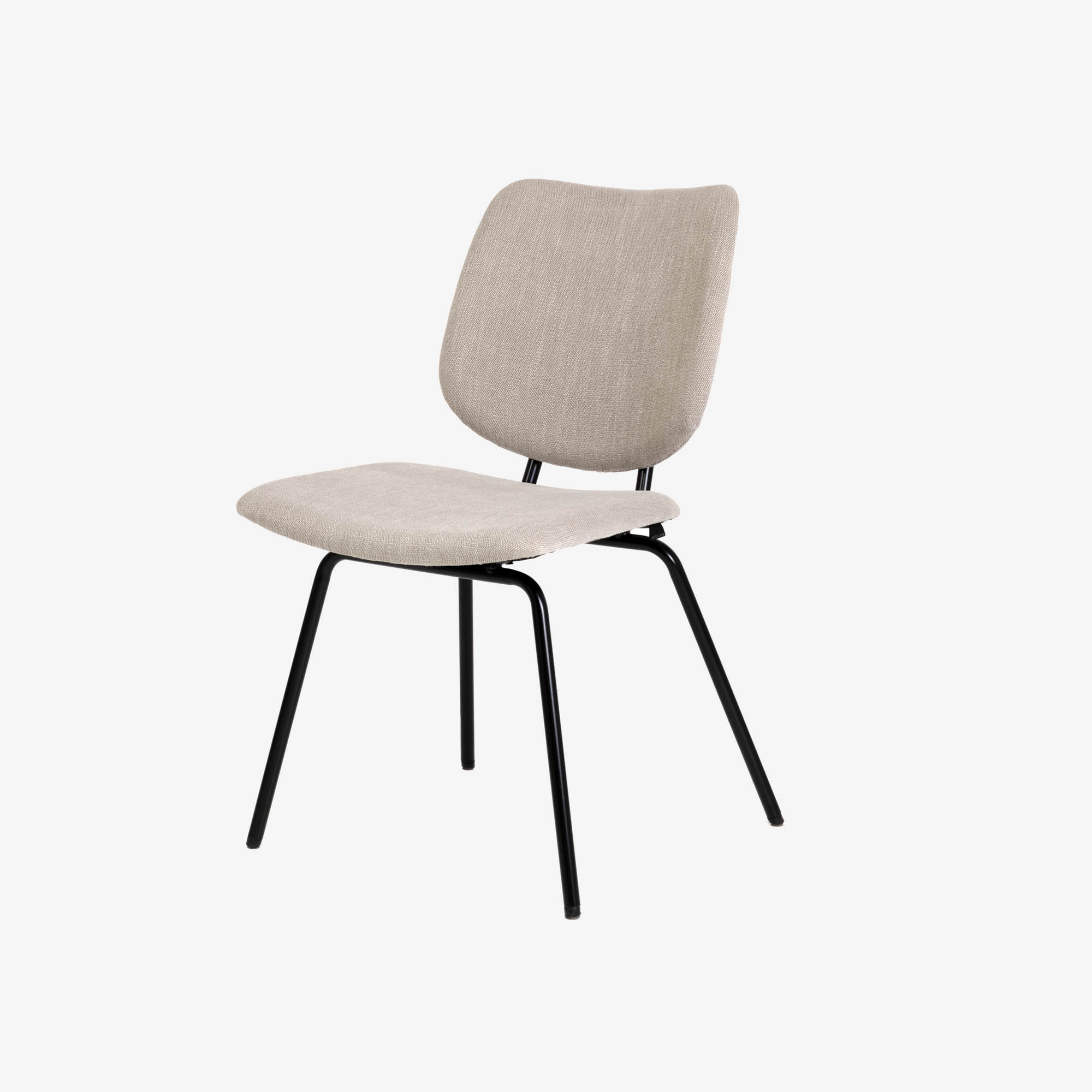 Elegant gestoffeerd kuipstoeltje met armleuning op modern zwart onderstel. Verkrijgbaar in 5 verschillende kleuren.
