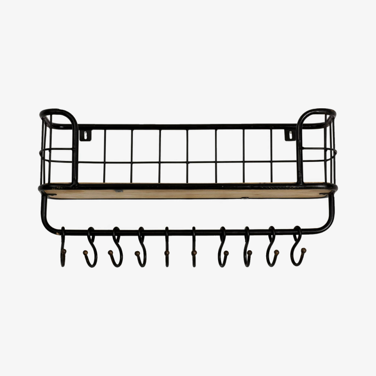 Metalen hangkastje voorzien van 10 haakjes en een naturel houten plank