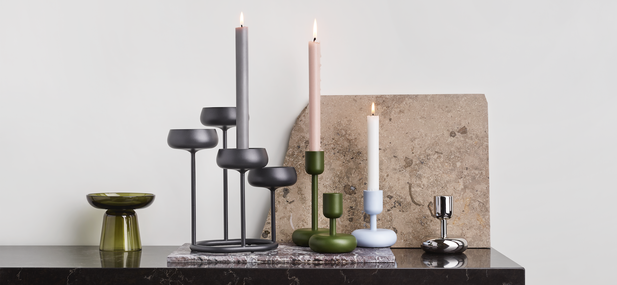 V.l.n.r.: Iittala Nappula sokkelvormige kaarsenhouder (€ 69,-*), vier-armige