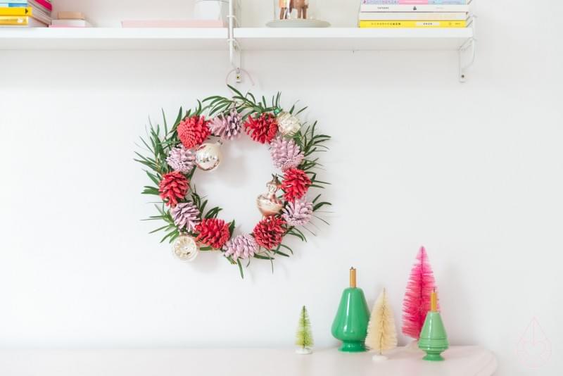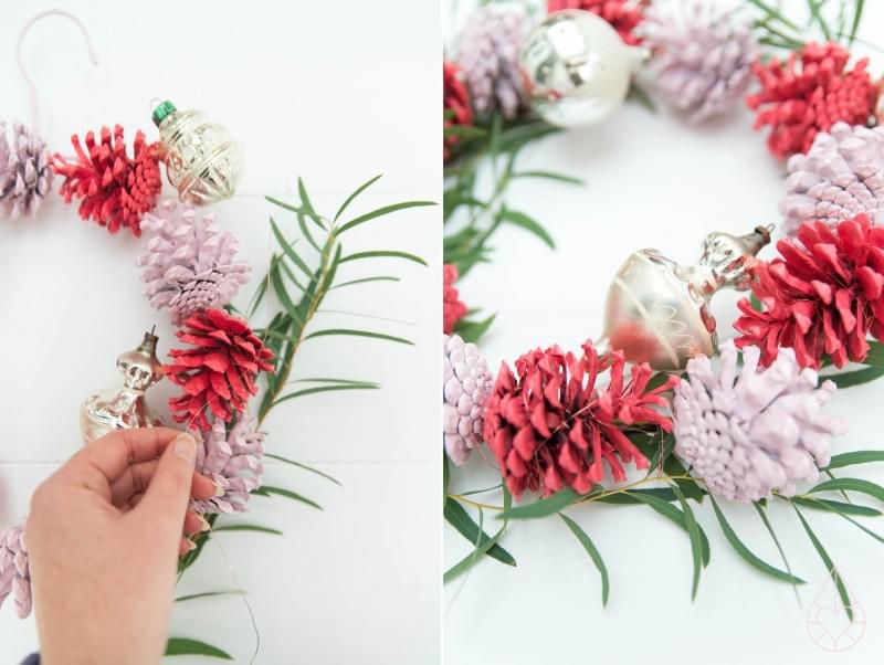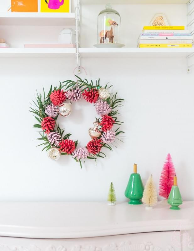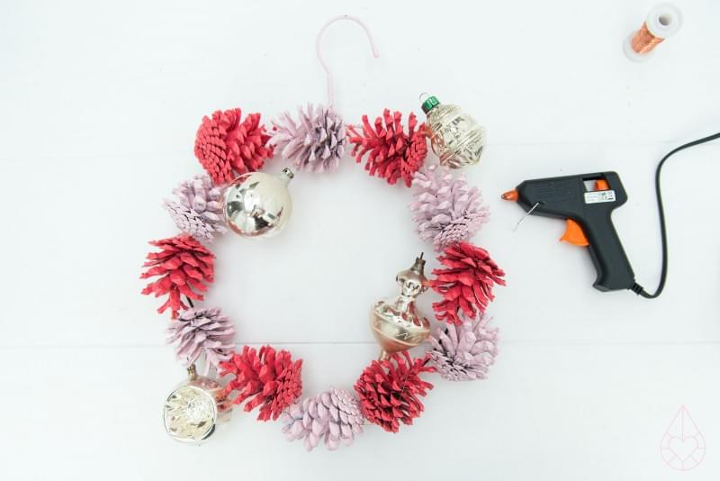 Met een kleerhanger, vintage kerstballen, dennenappels en verf maak je supersnel deze roze kerstkrans. Zin in een ander kleurtje? Dan kan natuurlijk ook!
