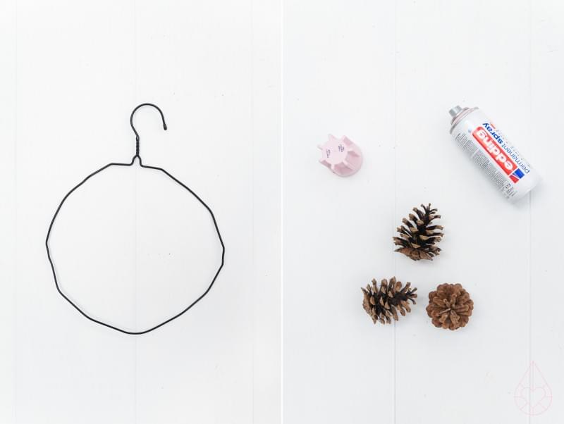 Buig de kleerhanger in een ronde vorm. Dit hoeft niet heel netjes, je ziet er uiteindelijk niet veel meer van. Spuit de dennenappels met de spuitbus in de door jou gewenste kleuren. Dat doe je het beste in meerdere dunne laagjes. Laat goed drogen. Als je wilt, kun je ook het haakje van de kleerhanger en kleurtje geven.