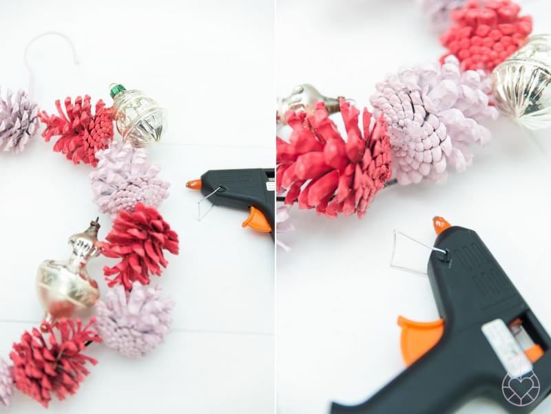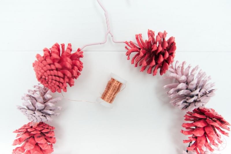 Als de dennenappels goed droog zijn, kun je ze met het koper- of binddraad gaan bevestigen aan de kleerhanger. Wikkel het draad om de dennenappels en de kleerhanger. Zorg dat de dennenappels elkaar min of meer raken, op deze punten ga je ze straks verder vastzetten met behulp van het lijmpistool.