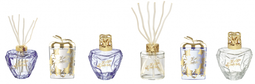 De collectie bevat een Lampe Berger, gelimiteerde geurkaarsen eneen parfumverspreider met sticks. Allen omhult met een blauwpaarse en een transparante glans, goud, klimopblaadjes en een libelle.