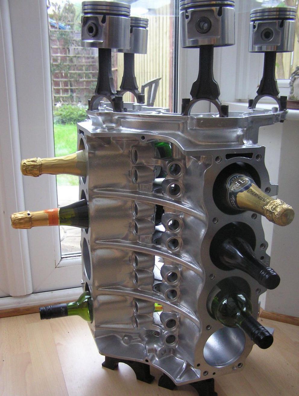 Het geraamte van een automotor - bijvoorbeeld deze gave V8 - is mooi bruikbaar als wijnrek. Je knapt het netjes op door te schuren en te lakken en je hebt het hart van je auto in je woonkamer. Bovendien is het ook nog functioneel, want het is een praktische plaats om je wijnflessen in te zetten.