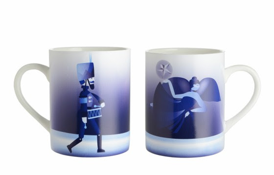 Mokken "Blue Christmas", ontworpen door Antonio Aricò voor Alessi. 9,5 x 11,8 cm. 11,8 cl. 35 cm diam. € 17 per stuk.