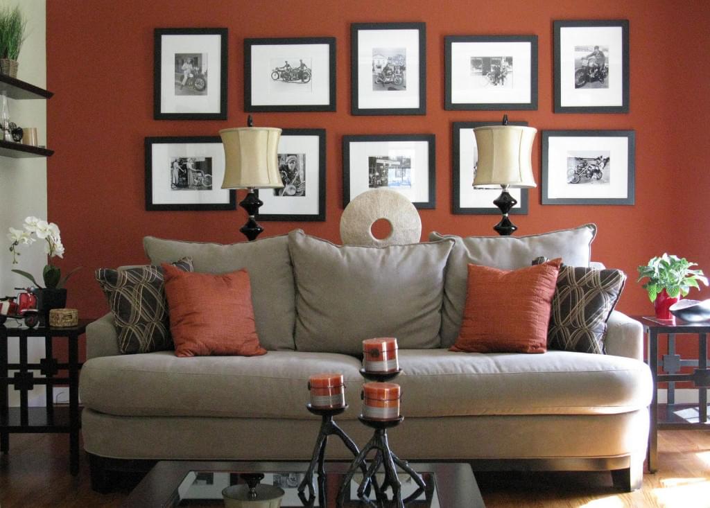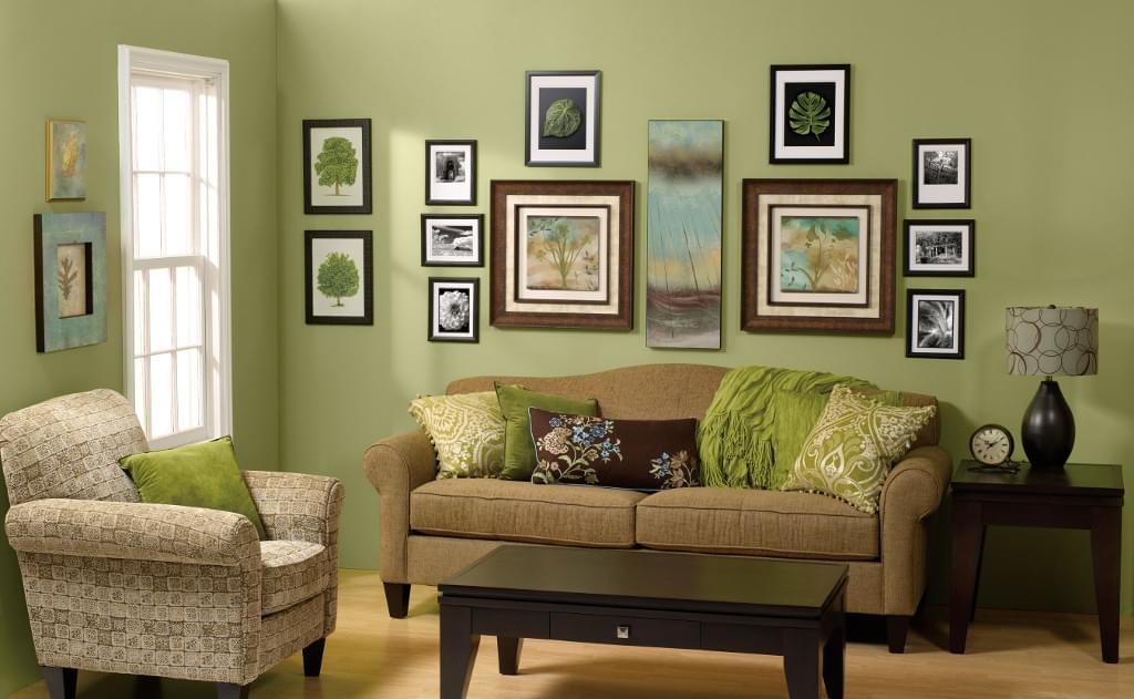 Een leuke, losse manier om fotolijsten op te hangen is door één lijst in het midden te hangen en hieromheen kleinere lijsten te plaatsen.