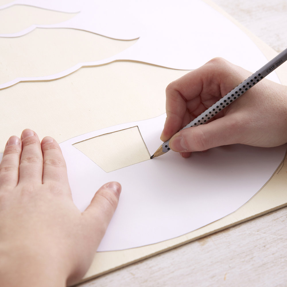 Stap 1: Gebruik een sjabloon en teken de vorm van een kerstboom van 40 cm hoog en 25 cm breed op karton. Knip de vorm uit en trek hem met een potlood over op een stuk multiplex van 40 bij 60 cm.
