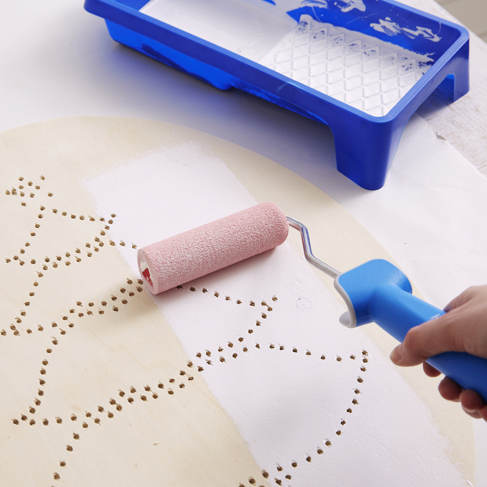 - Kleine verfroller, bakje en witte acrylverf