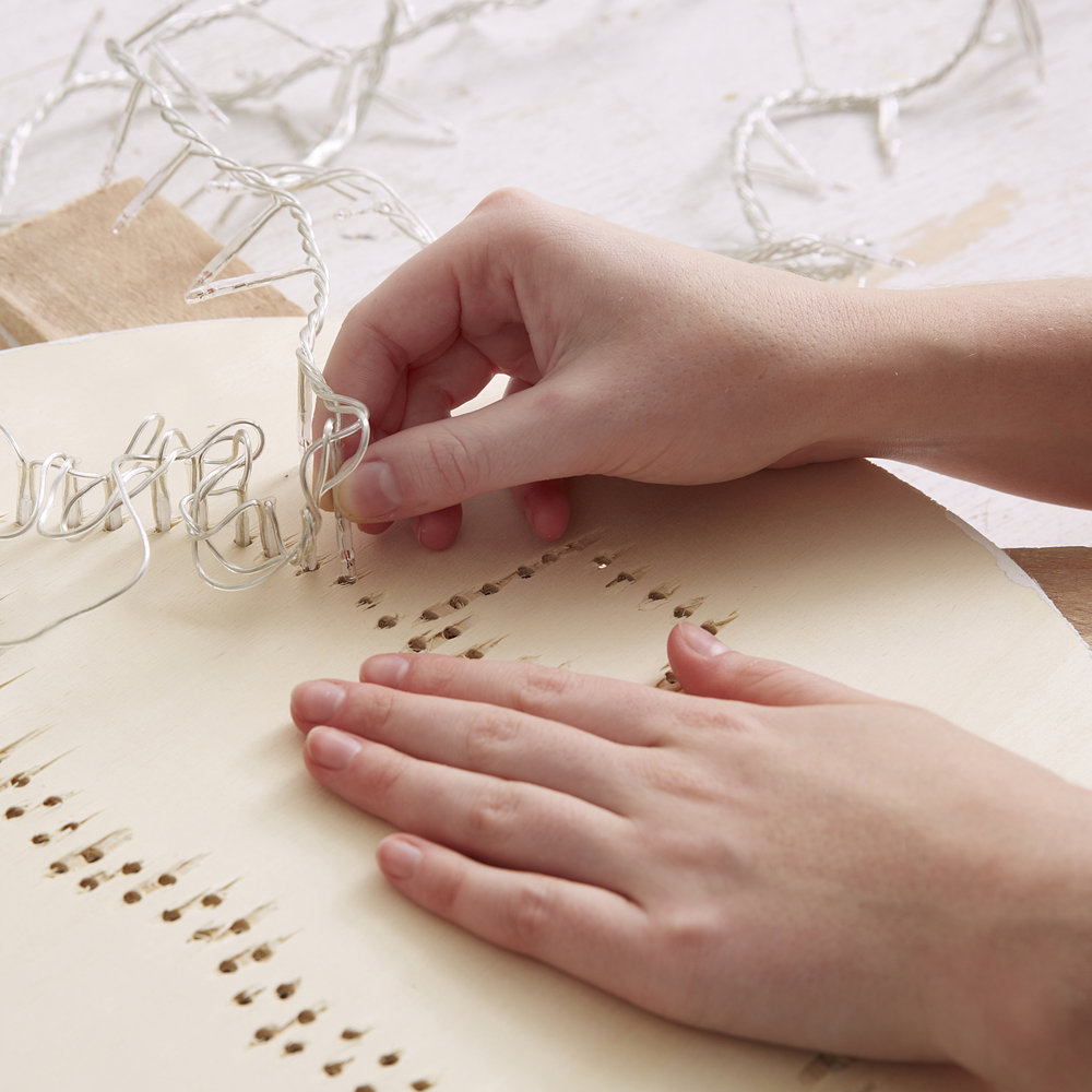 Stap 6: Doe de leds van een lichtsnoer in de gaatjes en laat de rest van het snoer recht naar beneden hangen. Bevestig je lamp daarna met twee schroeven aan de muur. Je wandlamp is nu klaar. Geniet van heel veel gezellige winteravonden!