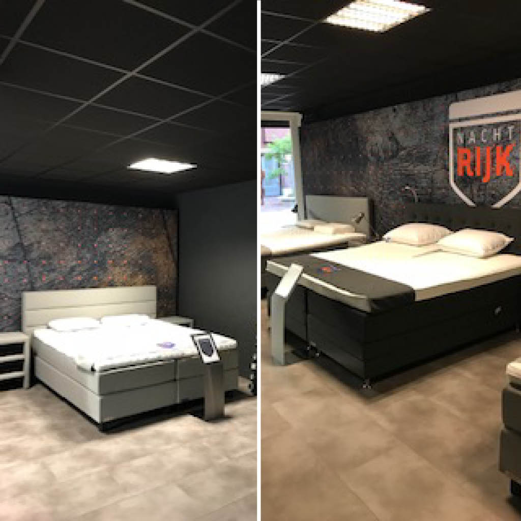 In de grote en mooi ogende showroom van ruim 1000m2 staan alle bekende merken en het huismerk overzichtelijk gepresenteerd. Onder het genot van een kopje koffie zullen de ervaren verkoopadviseurs samen met u proberen de ultieme slaapoplossing te vinden, onze slogan is dan ook "Wij hebben een slaapoplossing voor iedereen."