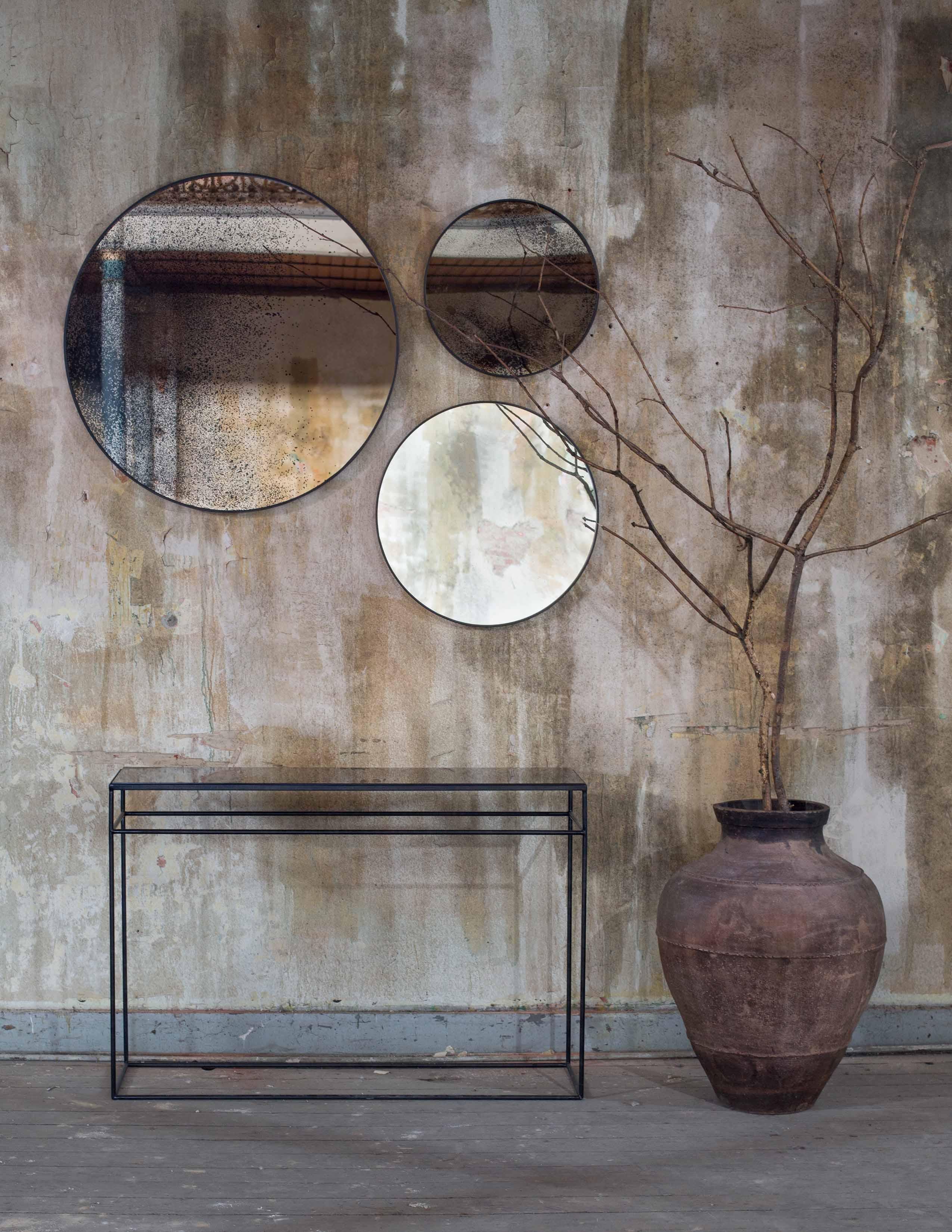 De aged mirrors collectie van Notre Monde is een knipoog naar de vintage trend die tegenwoordig speelt. De Bronze Console is een grote, cirkelvormige spiegel. De vorm en kleur maken van de spiegel een statement piece en geven hem tegelijkertijd een zachte uitstraling.
