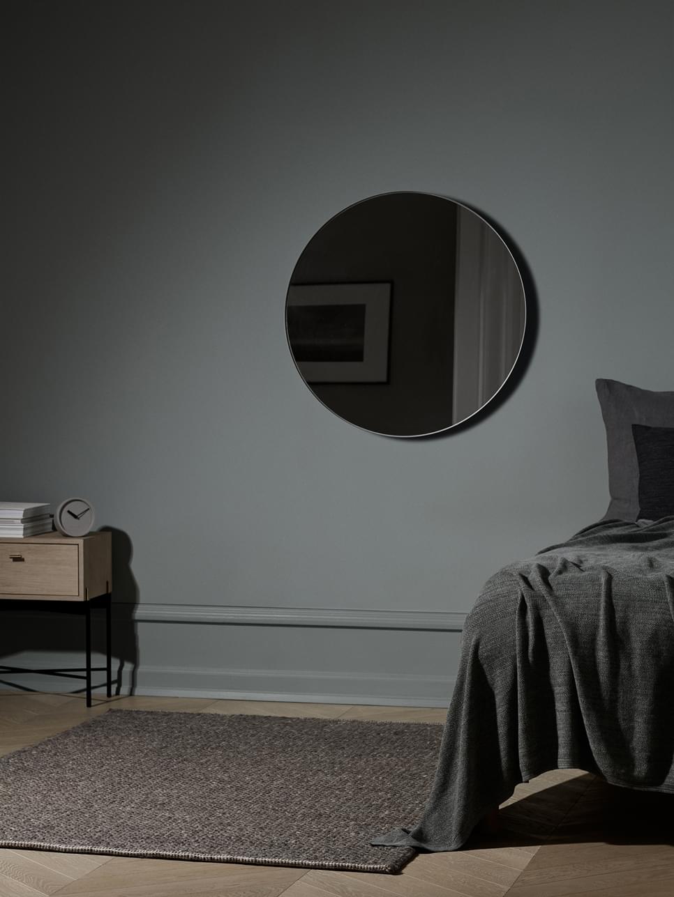 Het ontwerpteam van blomus moest een spiegel ontwerpen die bij Curl past. Dit is Rim geworden. Een ronde spiegel met gerookt glas en een elegant kader van gespoten staal in de kleuren nomad, steel grey en ashes of roses.