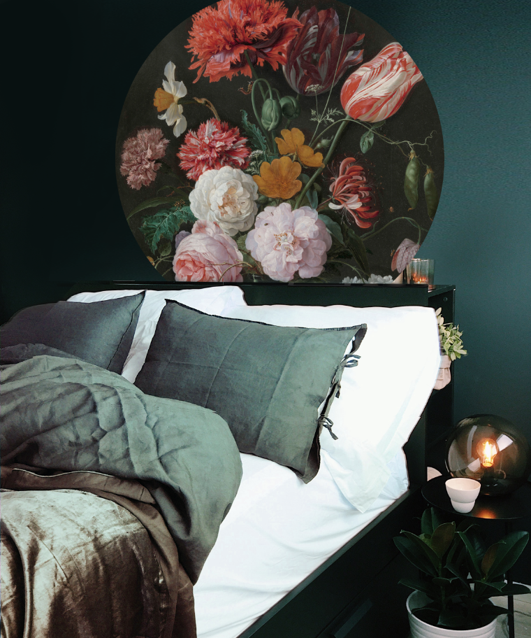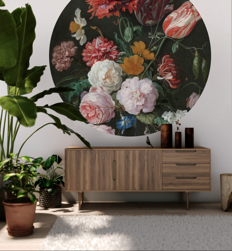Prachtige Wandcirkels met bloemen verkrijgbaar bij Funqy Wall Art, Kies je voor behang, zelfklevend behang of één van onze plaatmaterialen zoals Forex of Dibond? Je krijgt er een ophangsysteem bij, dan kun je hem nog eens verplaatsen.