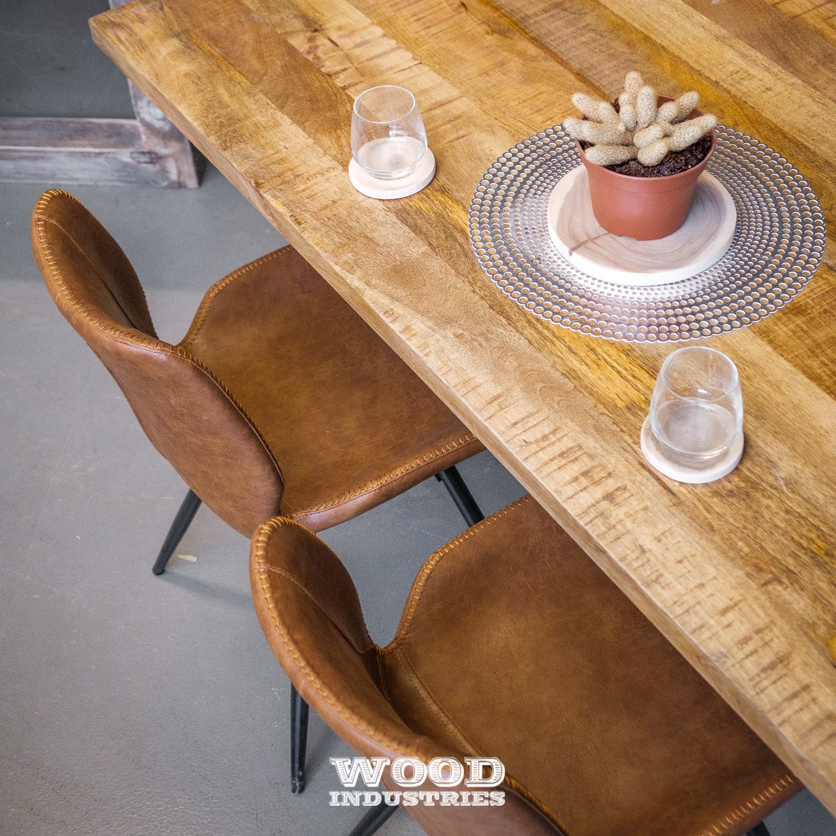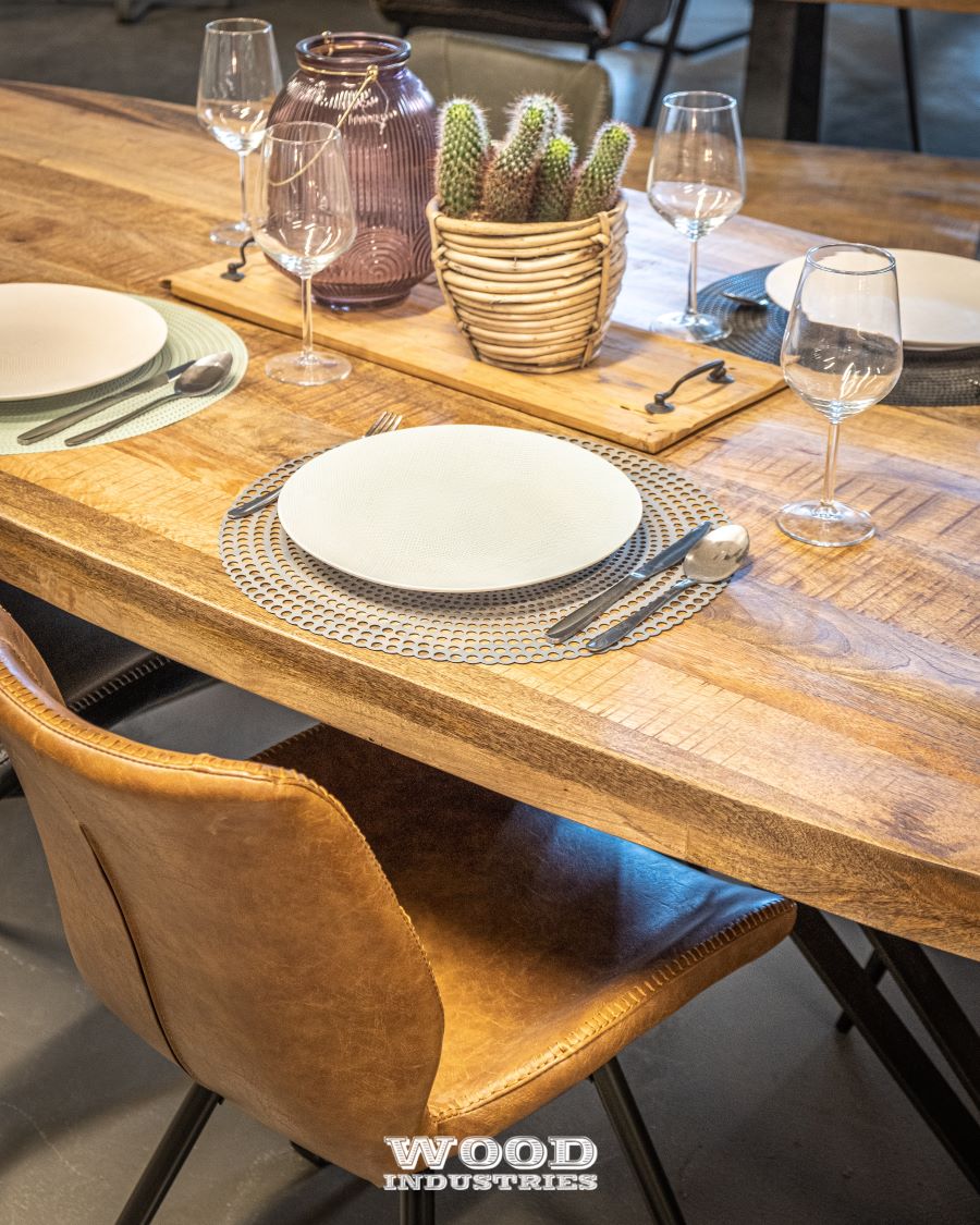 Dit blad van deze eettafel is gemaakt van Zuid-Amerikaans wrakhout. Deze robuuste ovale tafel wordt bij Woodindustries in eigen werkplaats gemaakt. Het blad is 6 cm dik – in dit geval opgedikt. De robuuste ovale eettafel spinpoot wordt geleverd met een midden onderstel naar keuze.